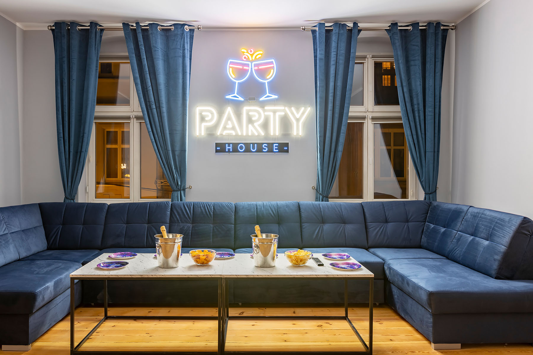 Premium VIP to nasz drugi największy apartament w centrum Poznania. 3 neony, stół z 16 krzesłami, salon z podwójną kanapą i mini dance floorem, niezależna strefa gier z beer pongiem, piłkarzykami i alkomasterem. W apartamencie znajduje się 65′ Smart TV. Całość dopełnia bar z kuchnią, część sypialna z piętrowymi łóżkami oraz 2 osobne łazienki z toaletami oraz prysznicami. Idealny na wieczory kawalerskie, panieńskie oraz imprezy okolicznościowe. Zachęcamy do skorzystania z wirtualnego spaceru znajdującego się na stronie.