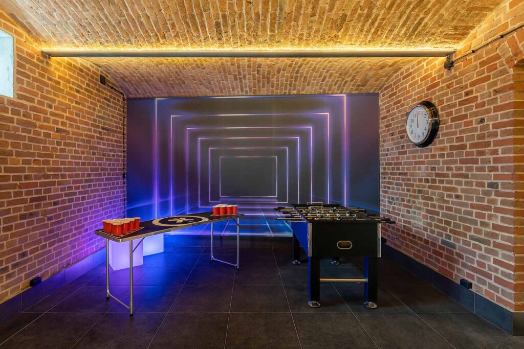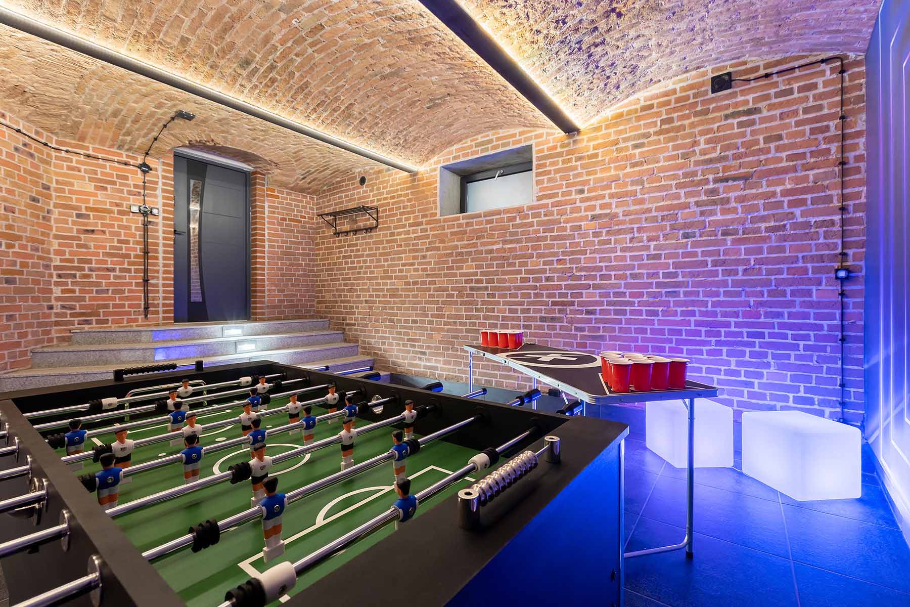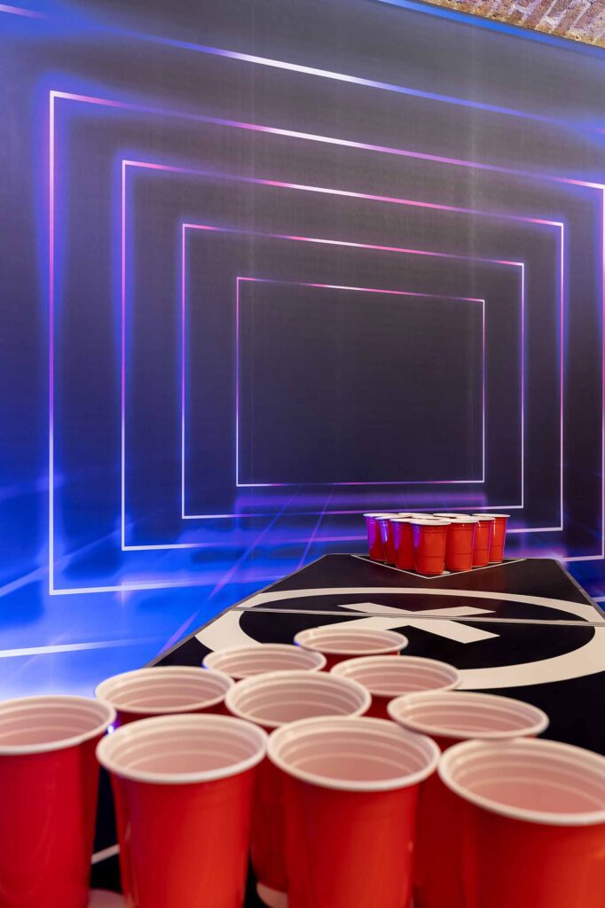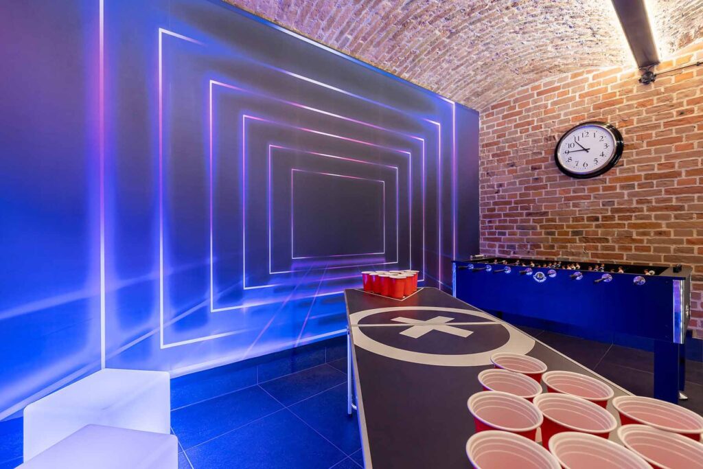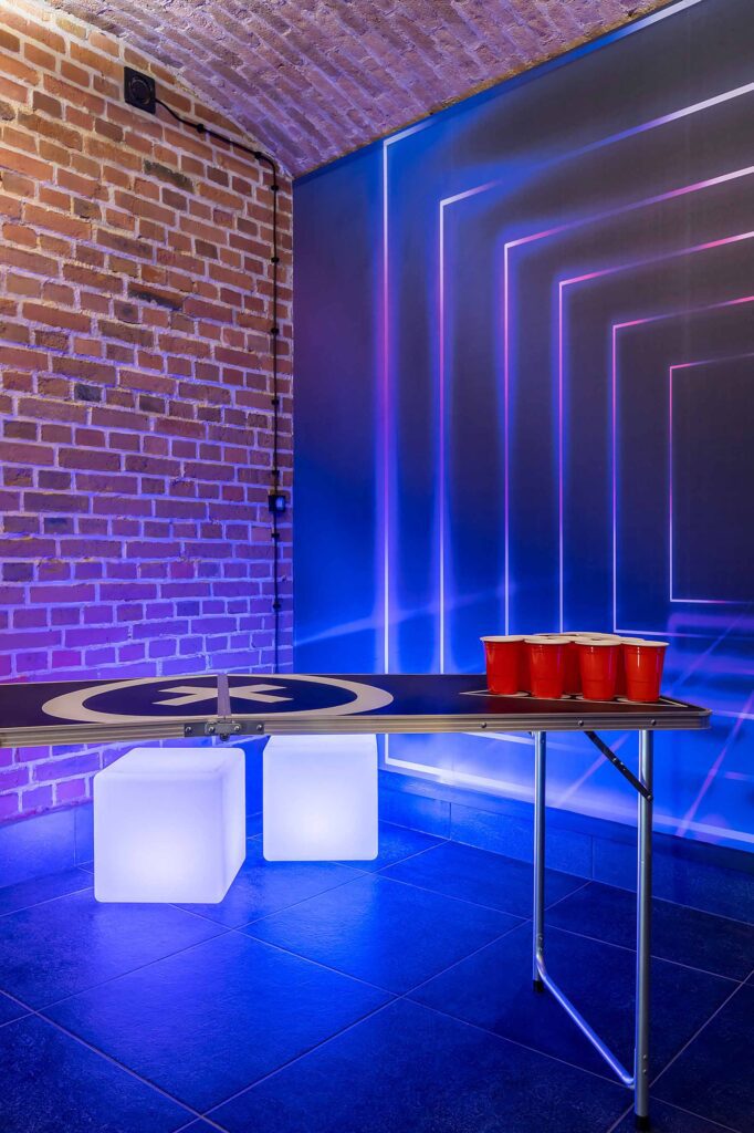 Kolejne pomieszczenie to Strefa Gier, gdzie znajduje się Beer Pong, na stole do beer ponga zostawiamy kubki oraz piłeczki do gry. W Strefie Gier znajdują się również piłkarzyki, wieszaki na ubrania, neonowa tapeta oraz kostki ledowe.