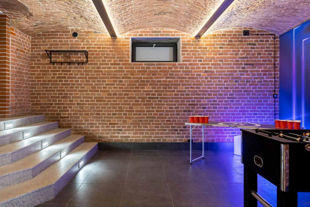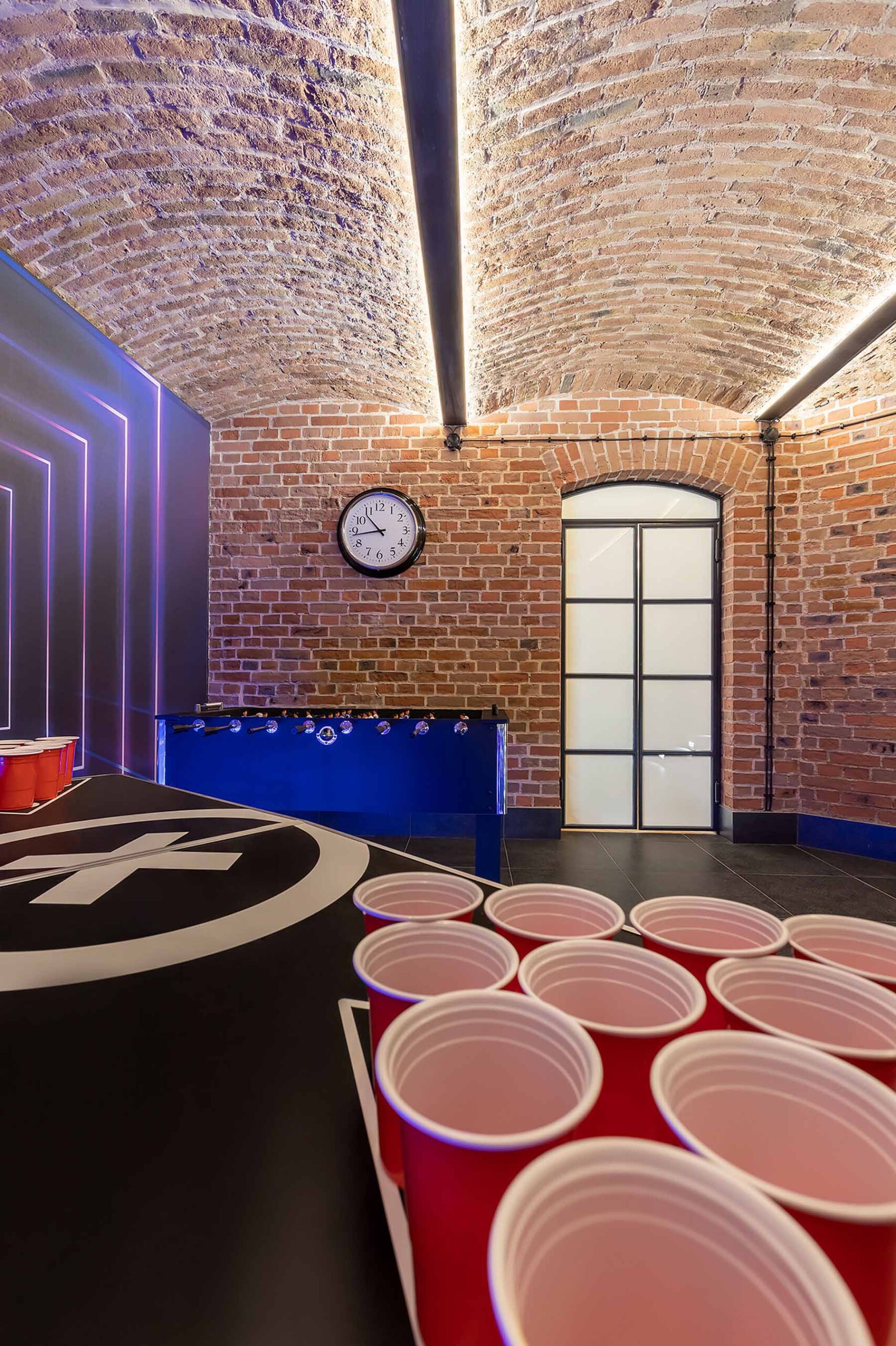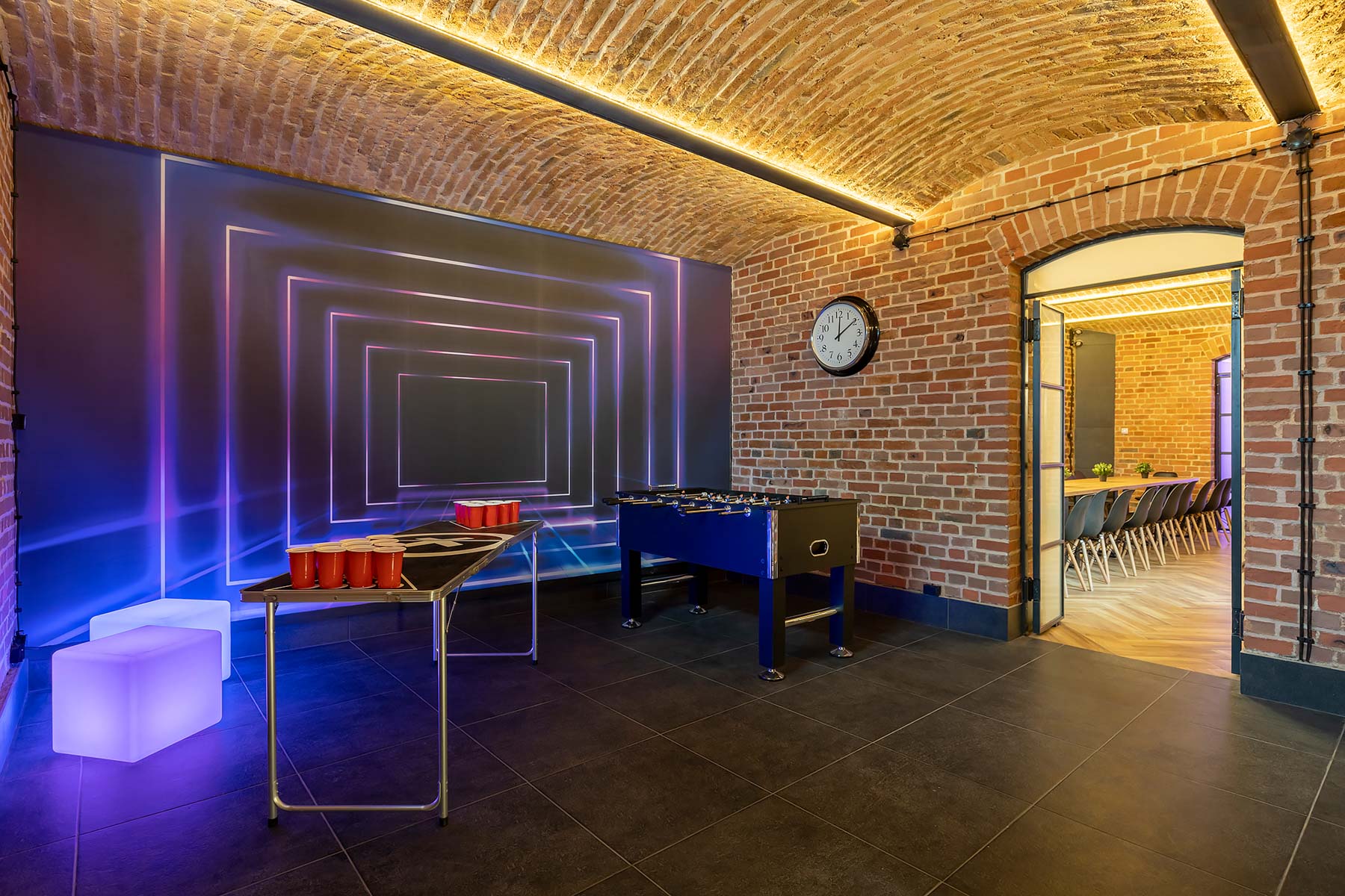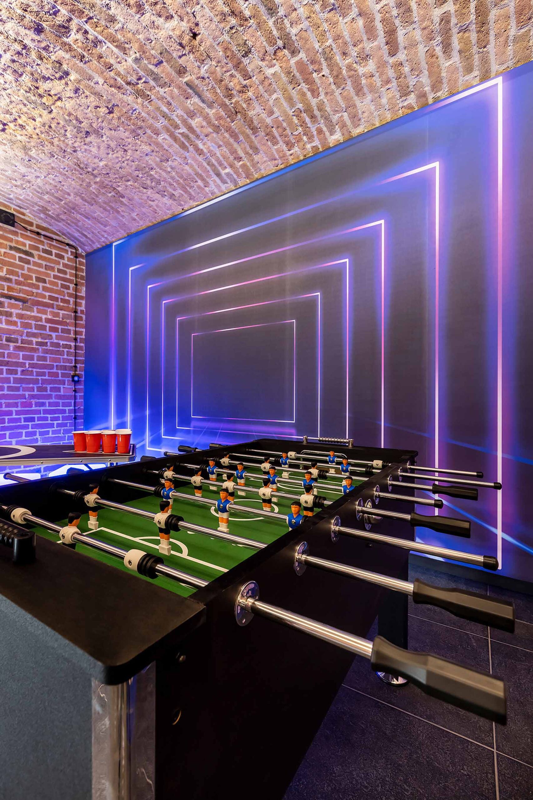Kolejne pomieszczenie to Strefa Gier, gdzie znajduje się Beer Pong, na stole do beer ponga zostawiamy kubki oraz piłeczki do gry. W Strefie Gier znajdują się również piłkarzyki, wieszaki na ubrania, neonowa tapeta oraz kostki ledowe.
