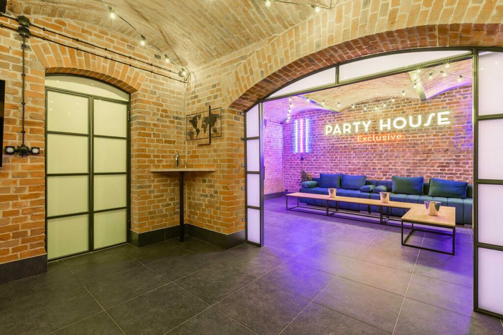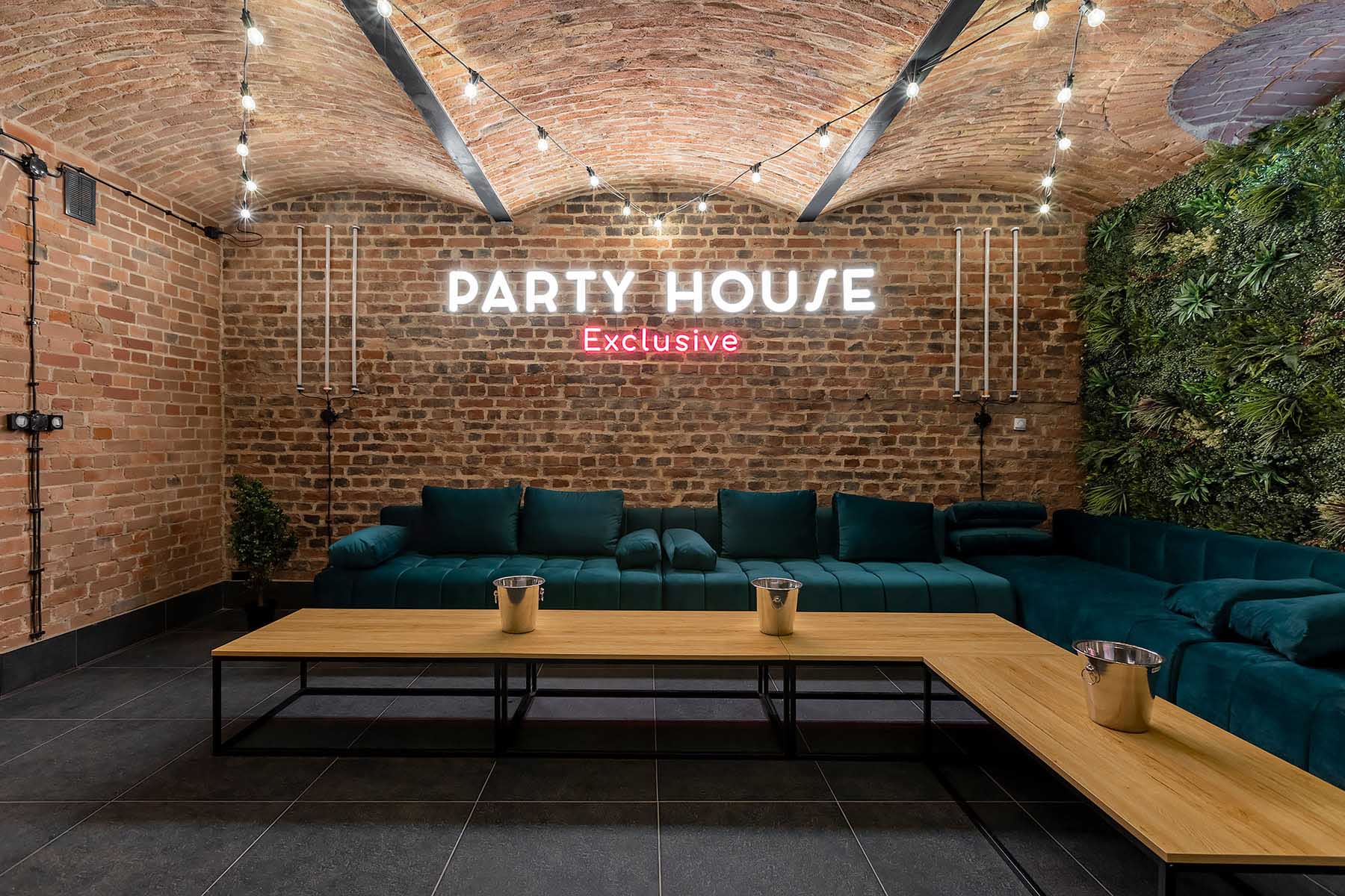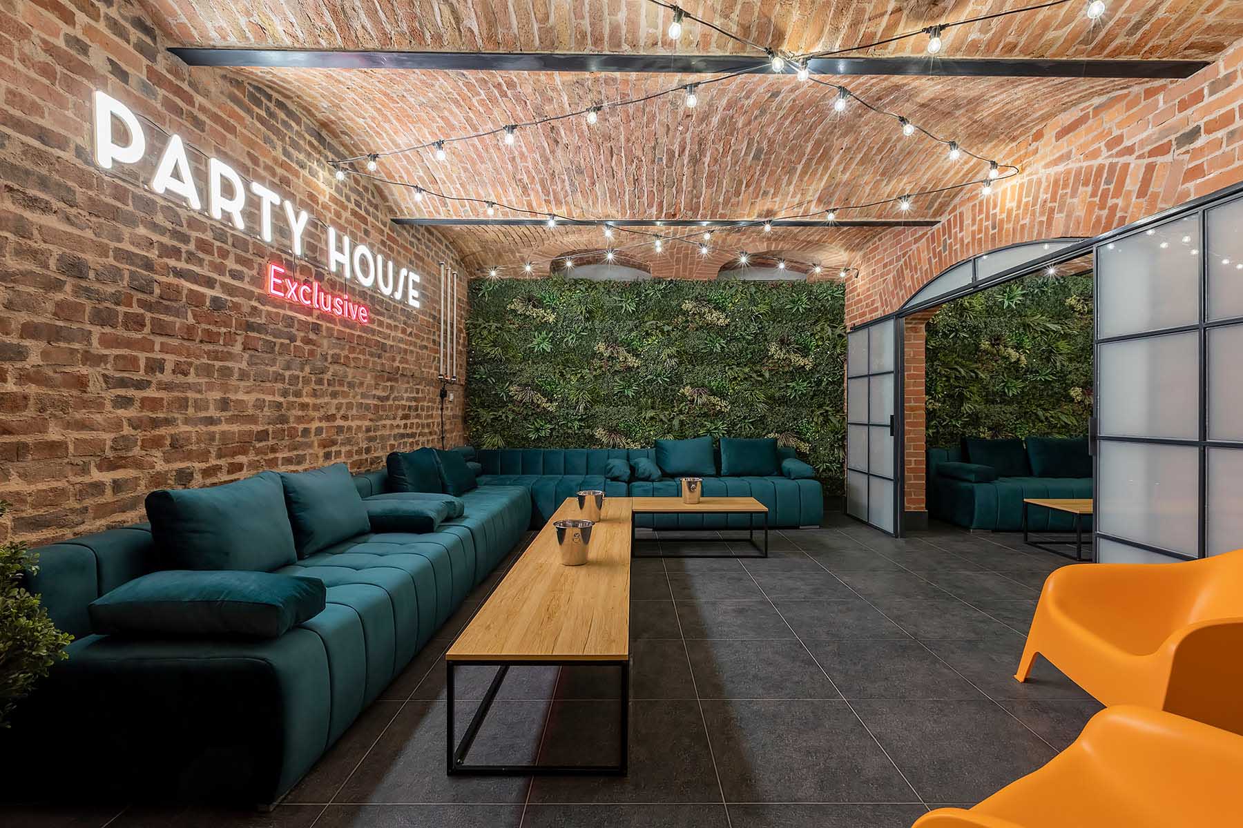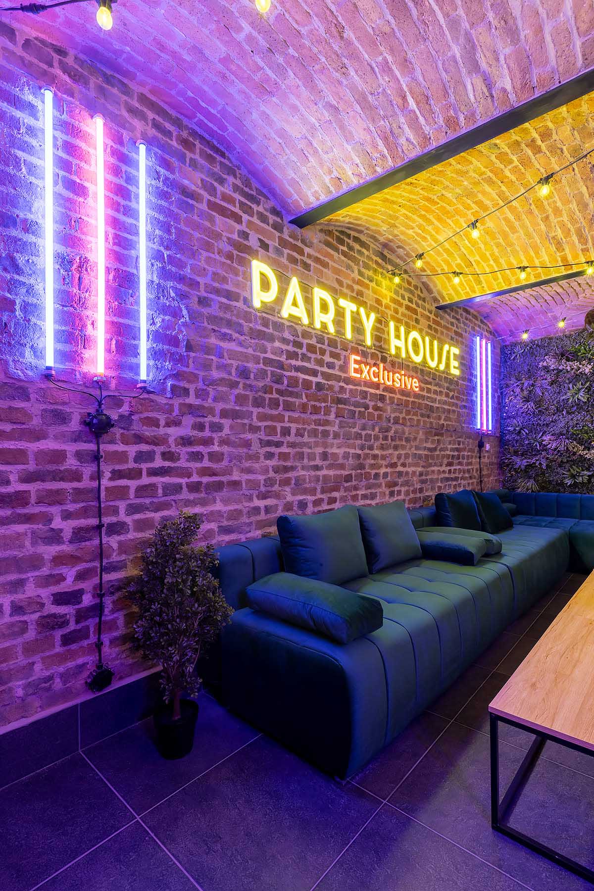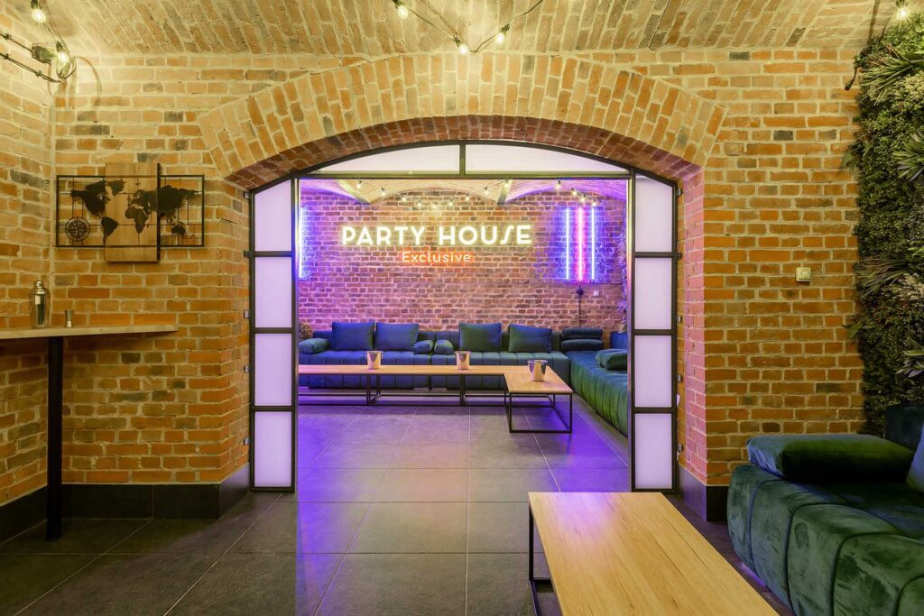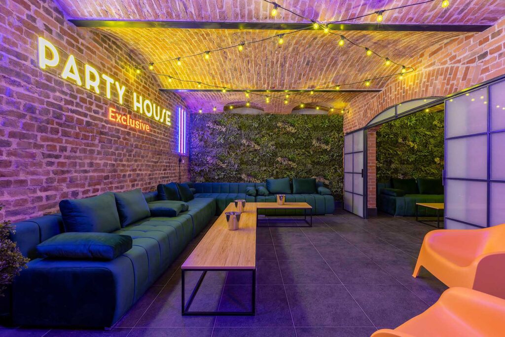 W salonach znajduje się 7 kanap, na których może usiąść ponad 20 osób, ściany udekorowane są zielenią, która ożywia i dodaje klimatu loftowemu wnętrzu. Znajduję się tu również główny neon Party House Exclusive na tle którego warto zrobić pamiątkowe zdjęcie oraz “dance floor”. Całość uzupełniają 65 calowy Smart TV oraz soundbar oraz stojące lampy ledowe. Salony mieszczą 14 miejsc noclegowych na rozkładanych kanapach.
