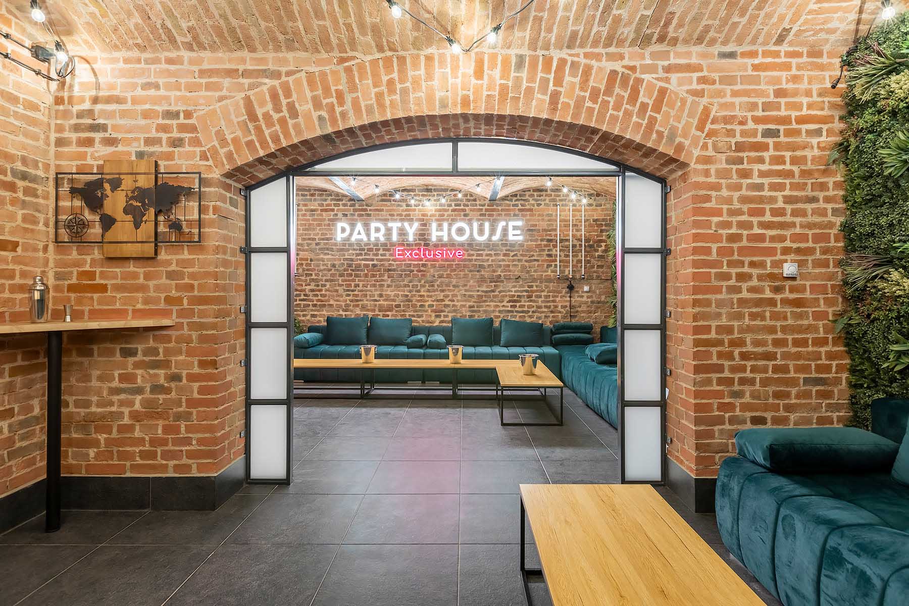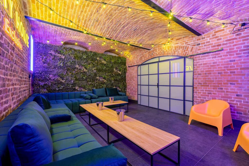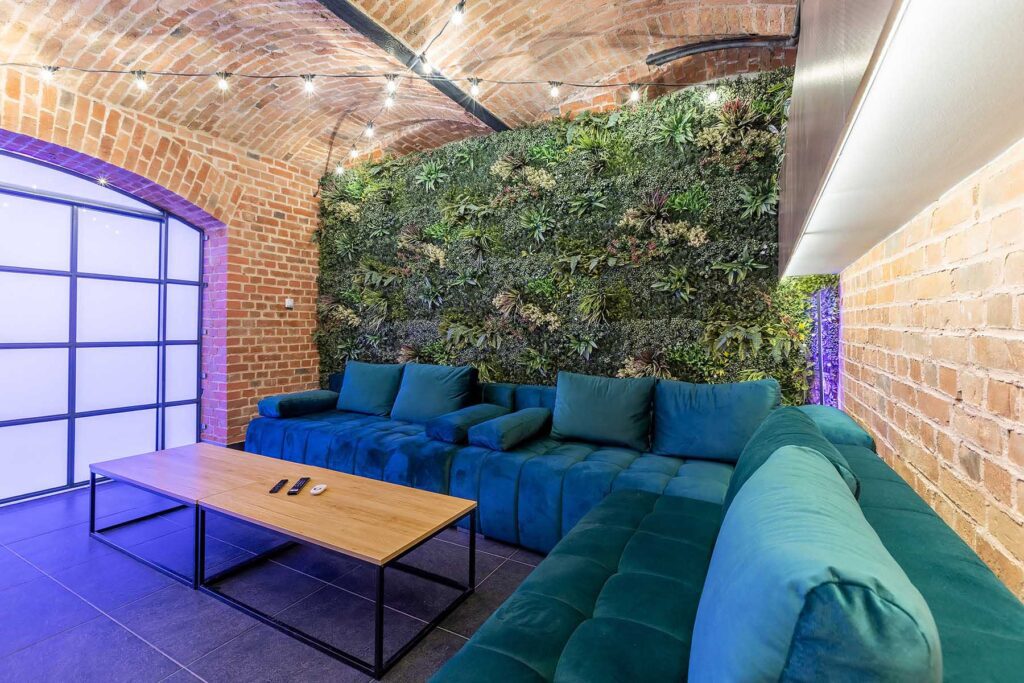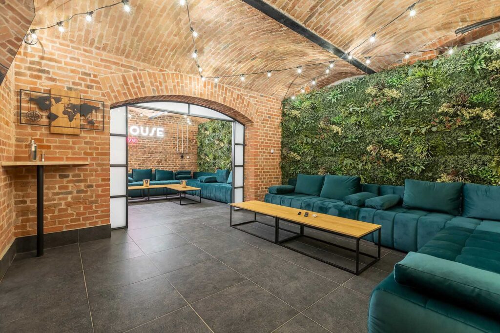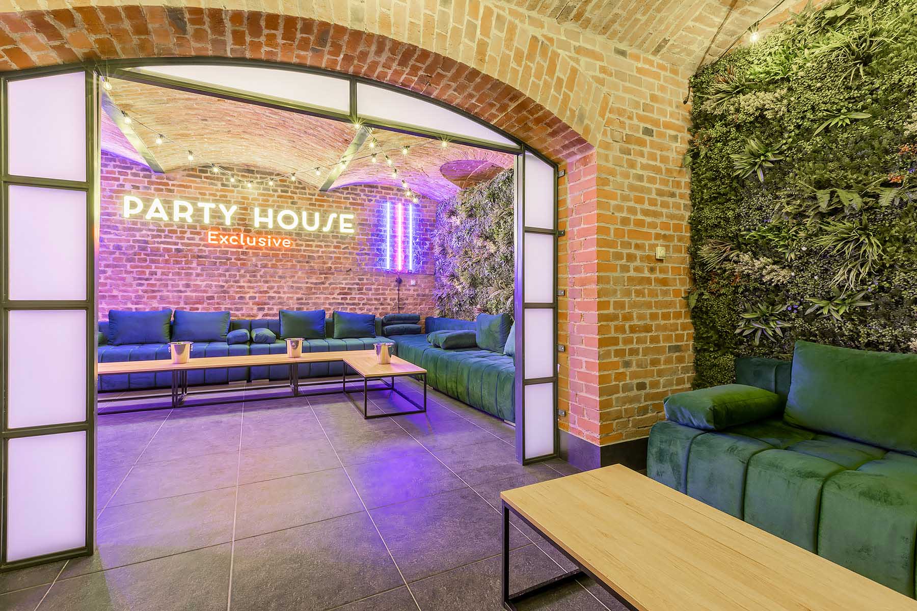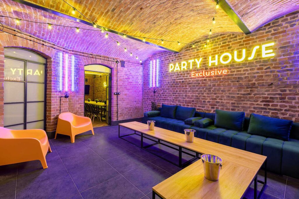 W salonach znajduje się 7 kanap, na których może usiąść ponad 20 osób, ściany udekorowane są zielenią, która ożywia i dodaje klimatu loftowemu wnętrzu. Znajduję się tu również główny neon Party House Exclusive na tle którego warto zrobić pamiątkowe zdjęcie oraz “dance floor”. Całość uzupełniają 65 calowy Smart TV oraz soundbar oraz stojące lampy ledowe. Salony mieszczą 14 miejsc noclegowych na rozkładanych kanapach.