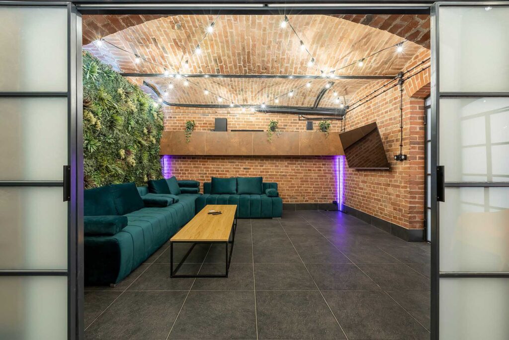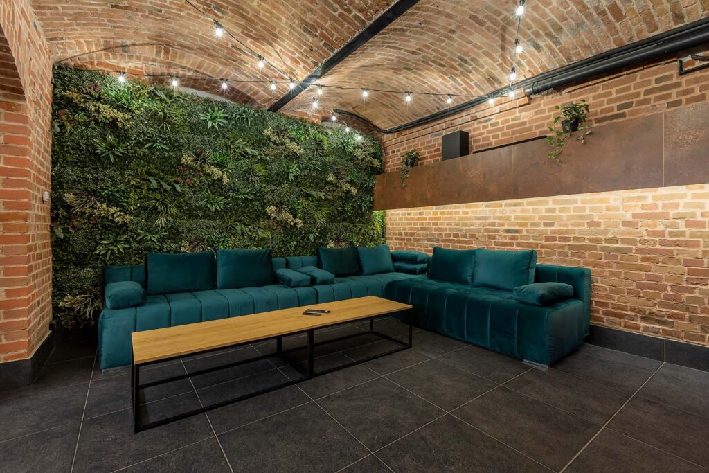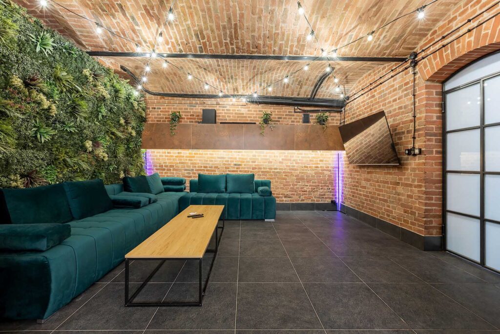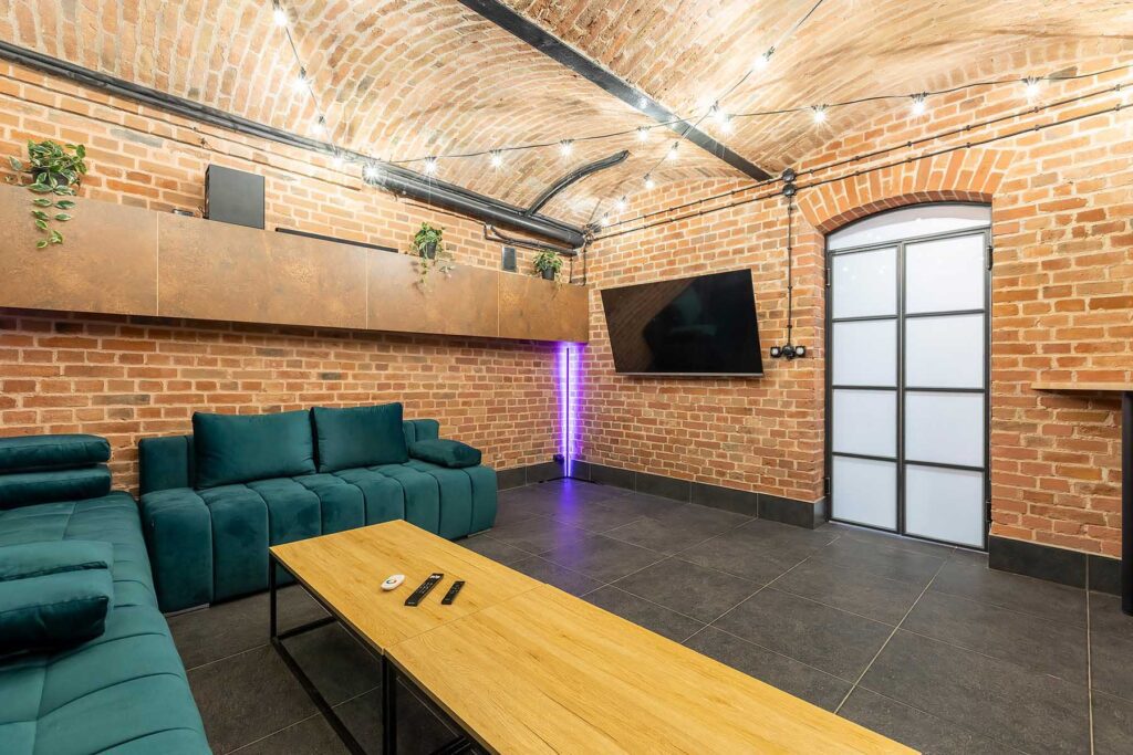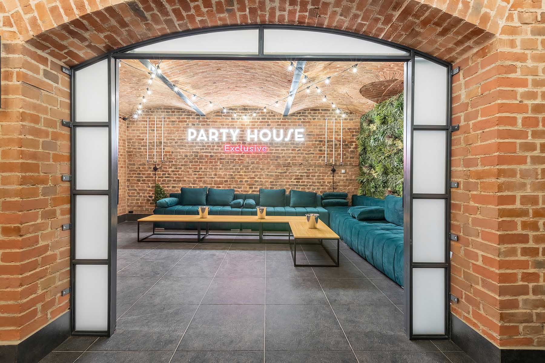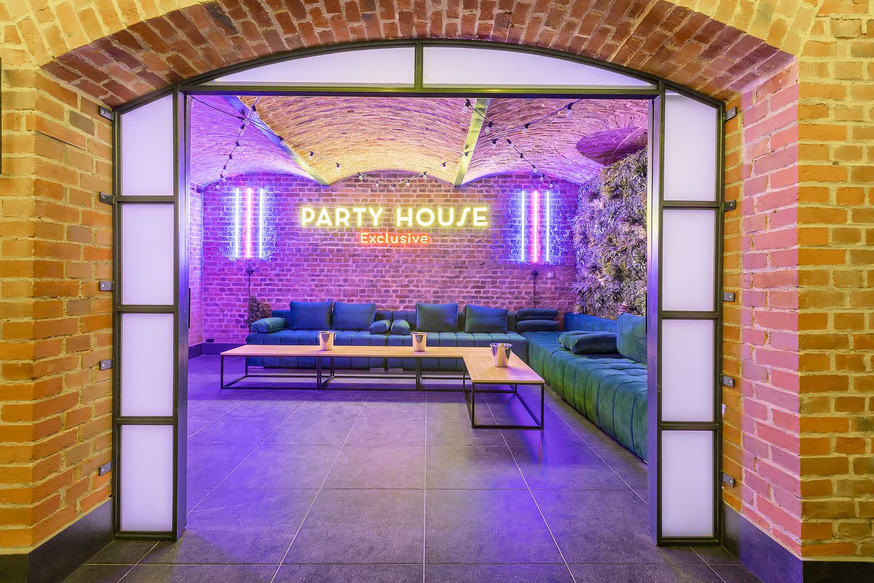 W salonach znajduje się 7 kanap, na których może usiąść ponad 20 osób, ściany udekorowane są zielenią, która ożywia i dodaje klimatu loftowemu wnętrzu. Znajduję się tu również główny neon Party House Exclusive na tle którego warto zrobić pamiątkowe zdjęcie oraz “dance floor”. Całość uzupełniają 65 calowy Smart TV oraz soundbar oraz stojące lampy ledowe. Salony mieszczą 14 miejsc noclegowych na rozkładanych kanapach.