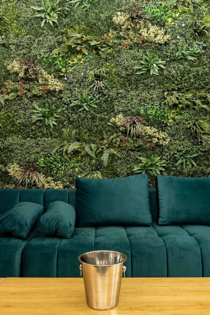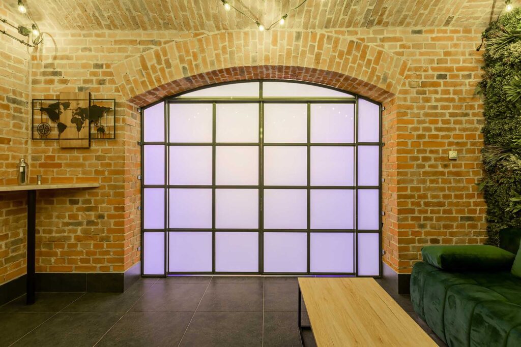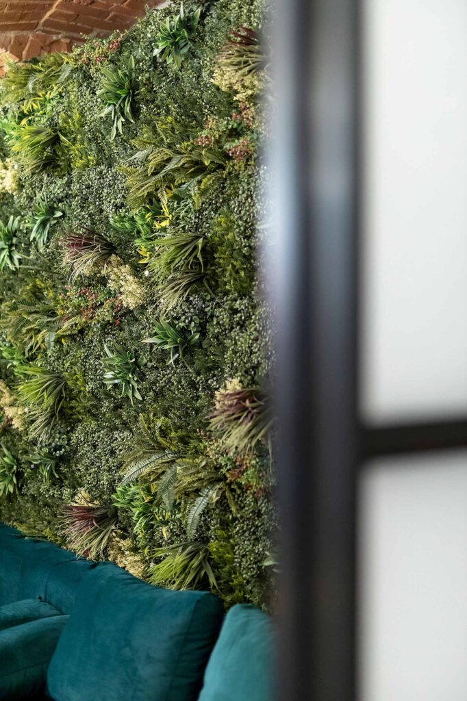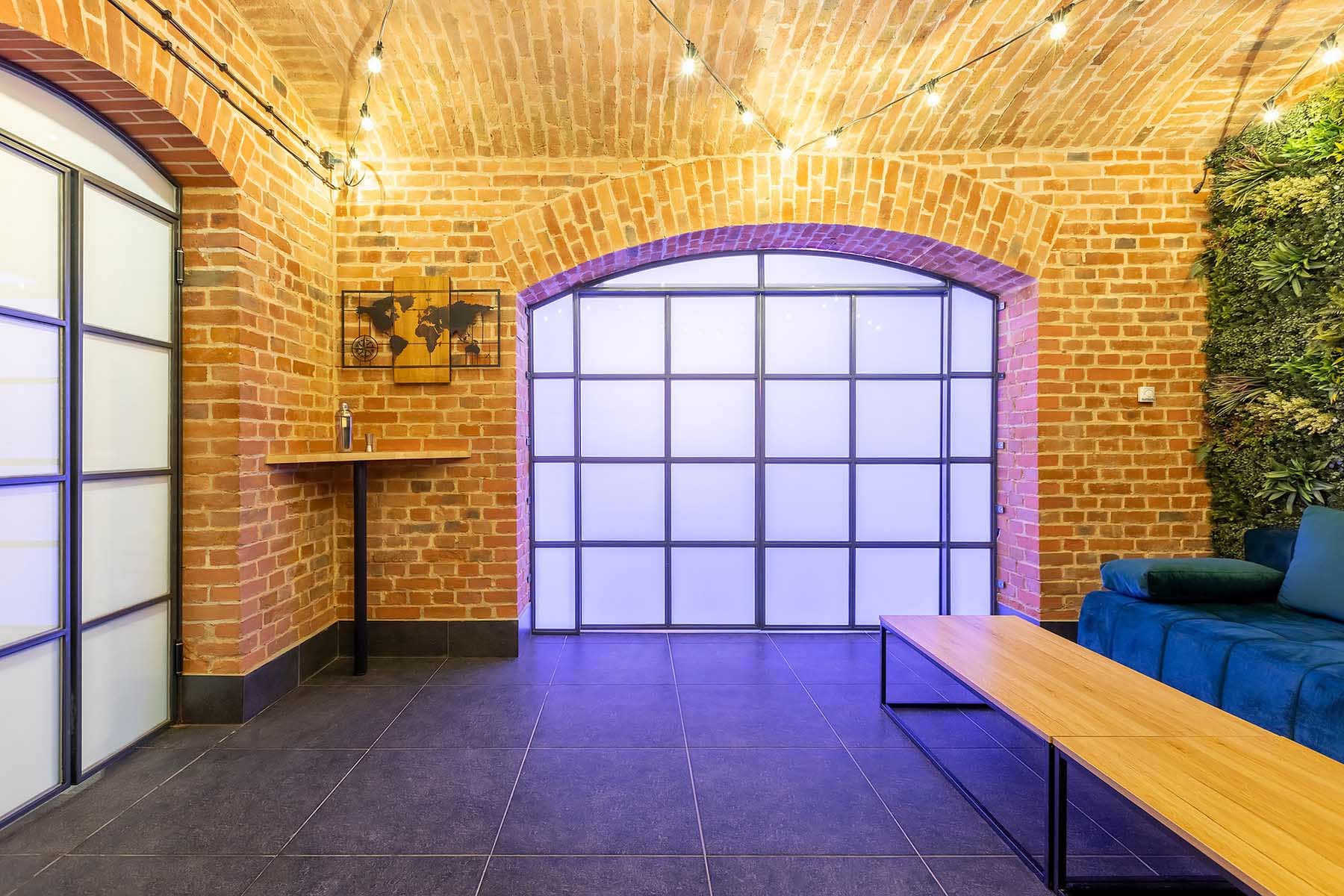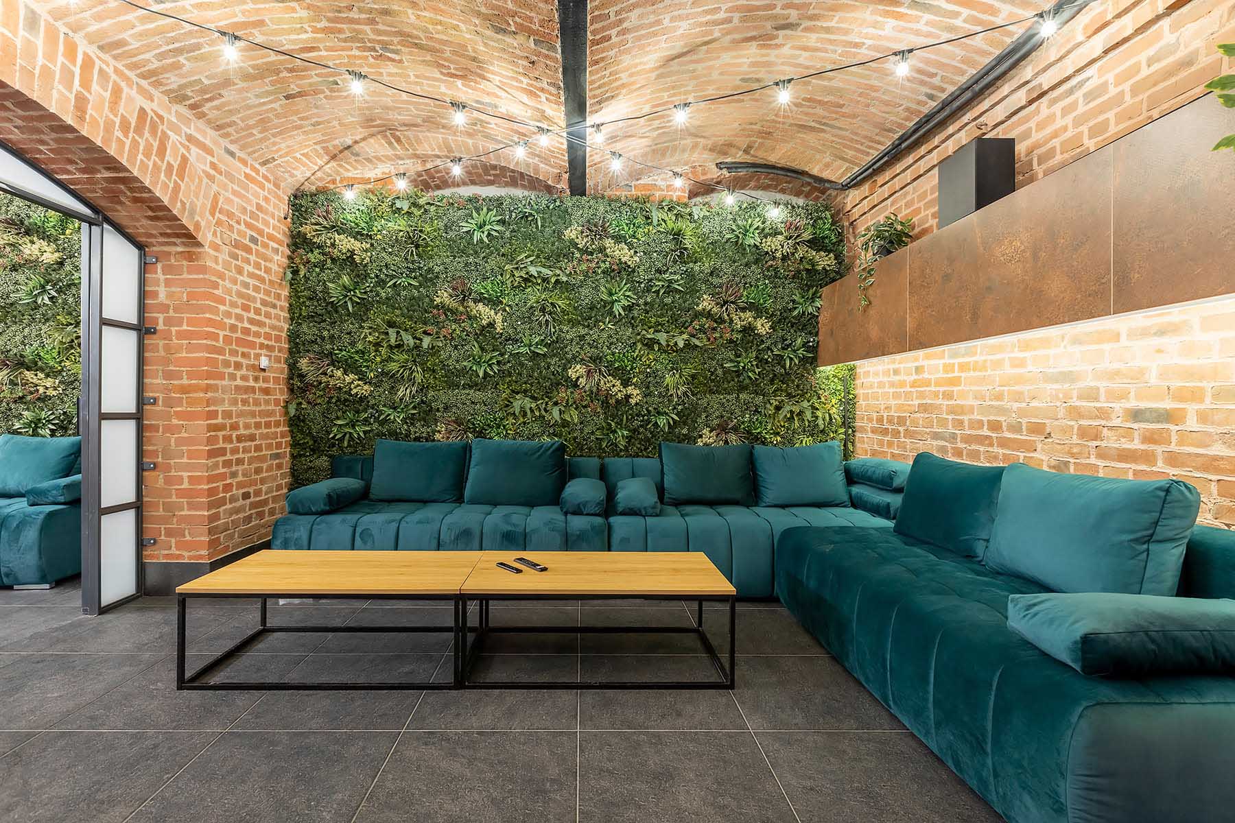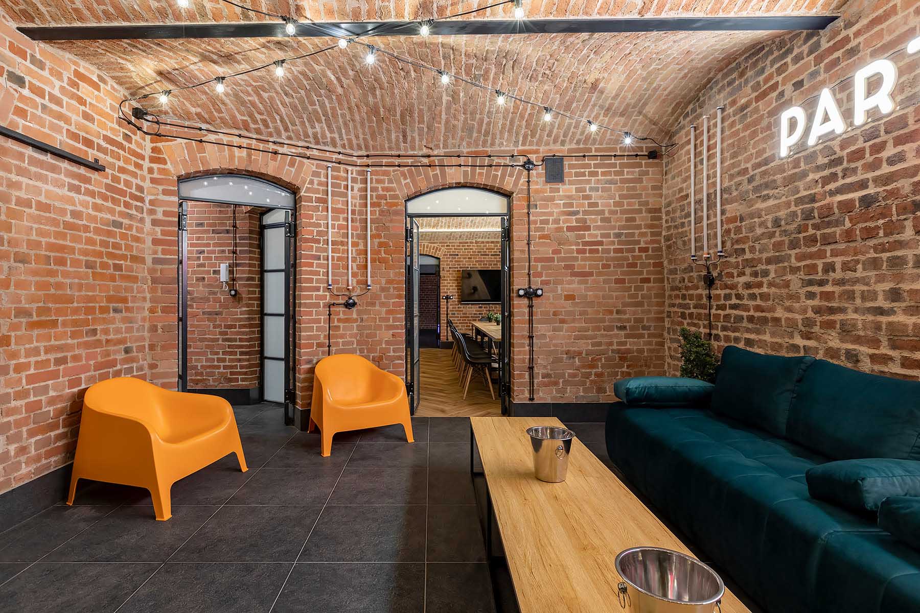W salonach znajduje się 7 kanap, na których może usiąść ponad 20 osób, ściany udekorowane są zielenią, która ożywia i dodaje klimatu loftowemu wnętrzu. Znajduję się tu również główny neon Party House Exclusive na tle którego warto zrobić pamiątkowe zdjęcie oraz “dance floor”. Całość uzupełniają 65 calowy Smart TV oraz soundbar oraz stojące lampy ledowe. Salony mieszczą 14 miejsc noclegowych na rozkładanych kanapach.