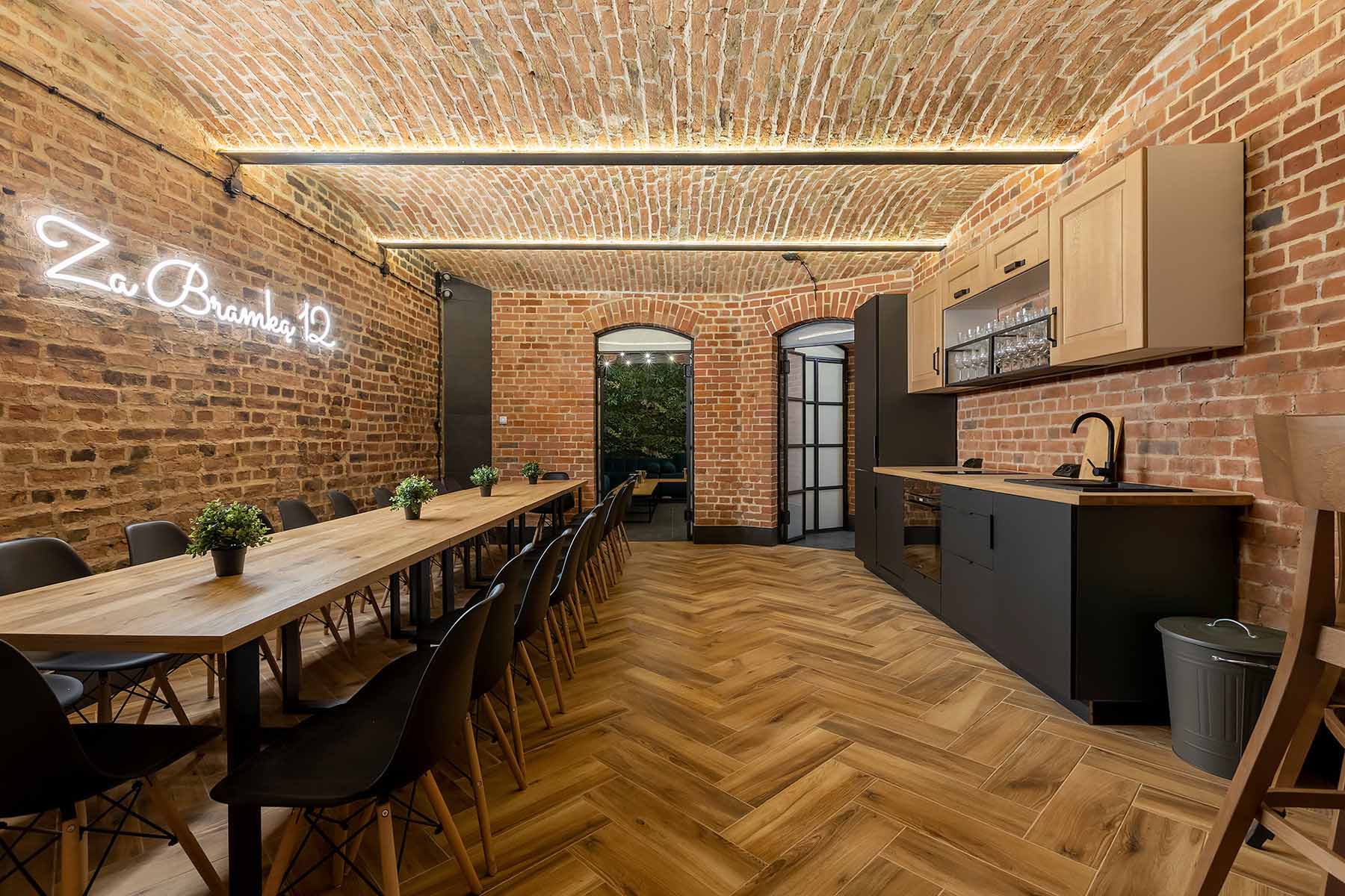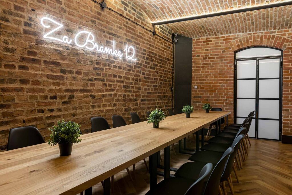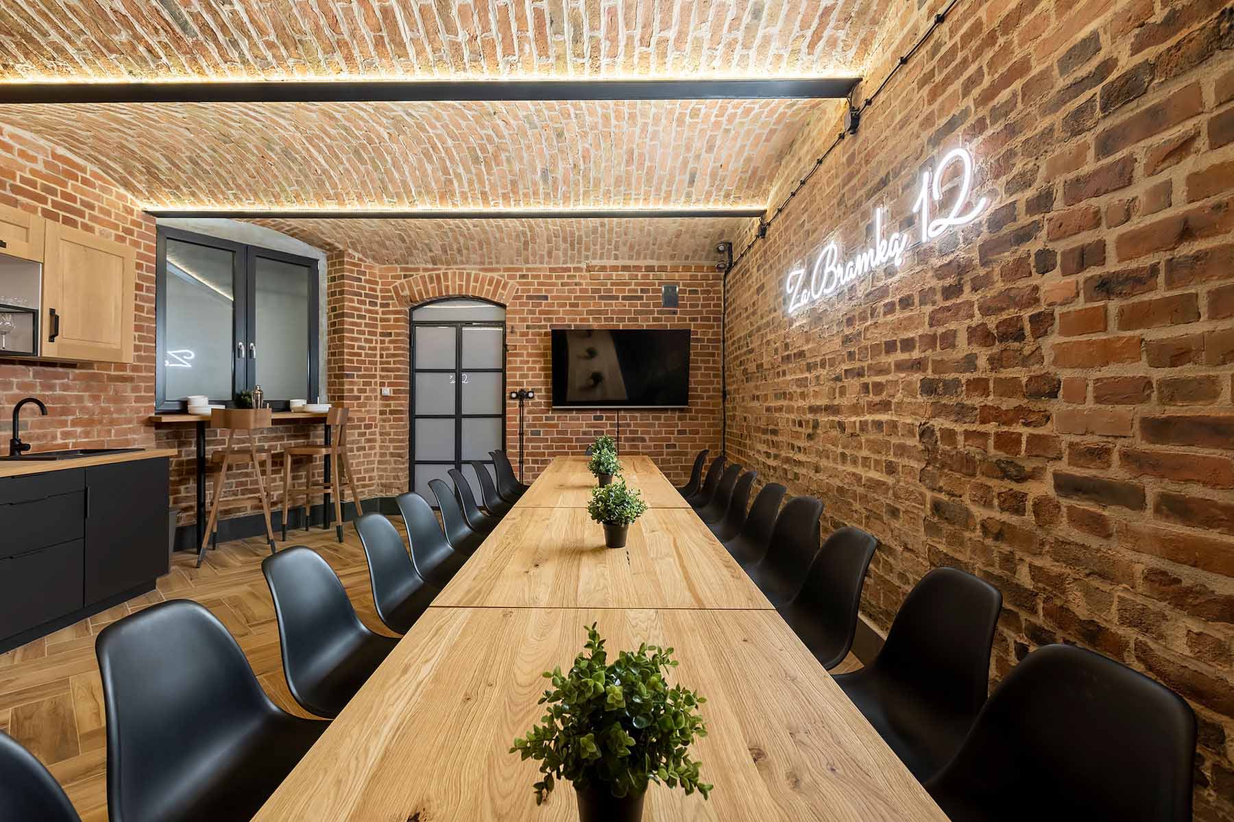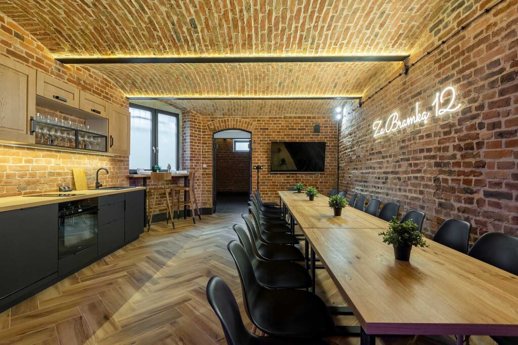 Jedno z pomieszczeń wyposażone zostało w pełni wyposażoną kuchnię z płytą ceramiczną oraz piekarnikiem. Znajdują się tu stoły z 22 krzesłami. W tej części również znajduje się 65 calowy telewizor, neon oraz stół z hokerami, który może być wykorzystywany do przekąsek lub postawienia bemarów. Świetnie nadaje się na przygotowywanie i spożywanie posiłków w większym gronie.