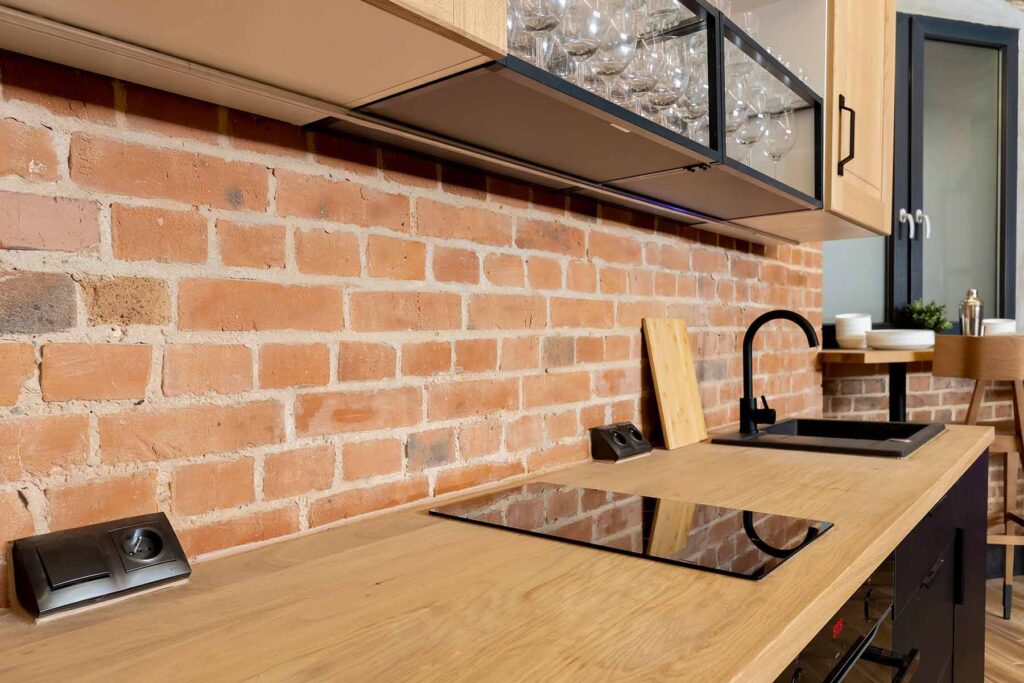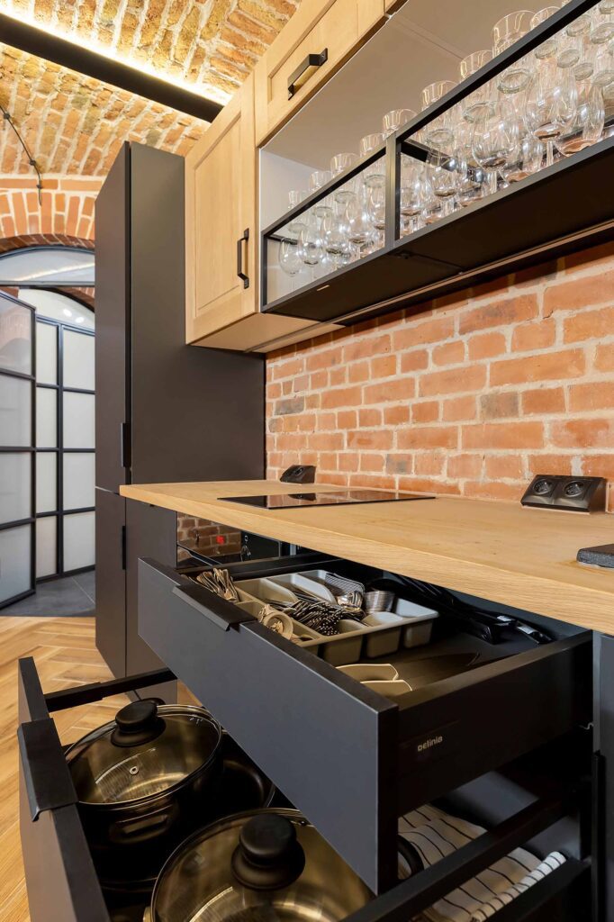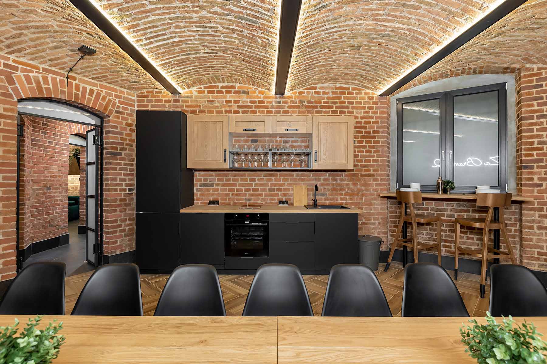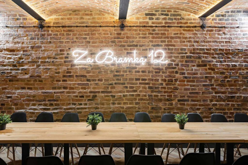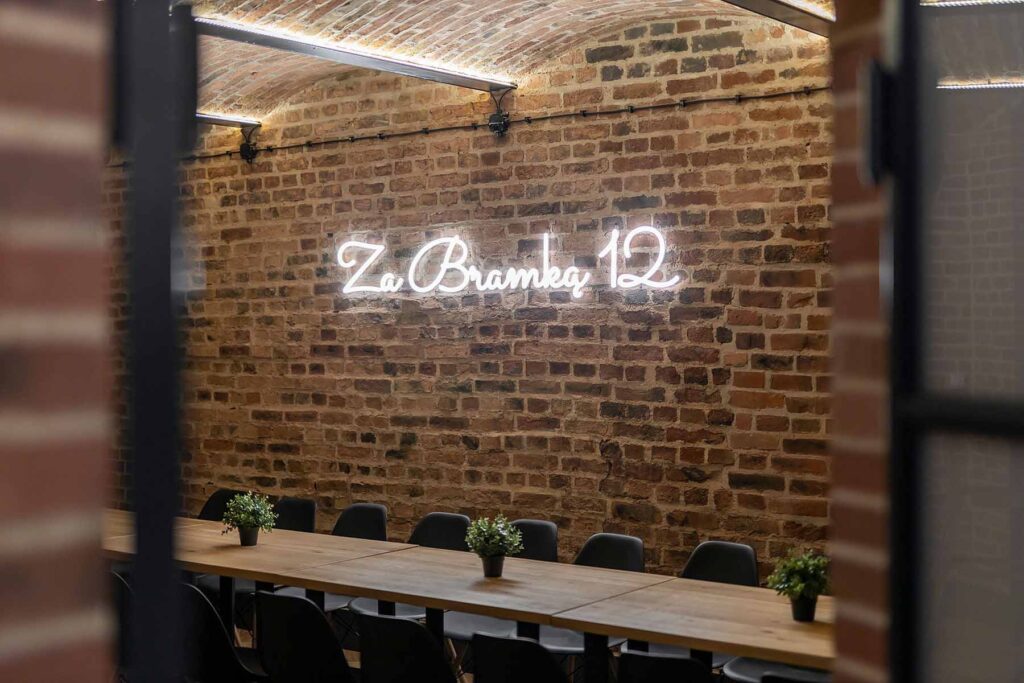 Jedno z pomieszczeń wyposażone zostało w pełni wyposażoną kuchnię z płytą ceramiczną oraz piekarnikiem. Znajdują się tu stoły z 22 krzesłami. W tej części również znajduje się 65 calowy telewizor, neon oraz stół z hokerami, który może być wykorzystywany do przekąsek lub postawienia bemarów. Świetnie nadaje się na przygotowywanie i spożywanie posiłków w większym gronie.