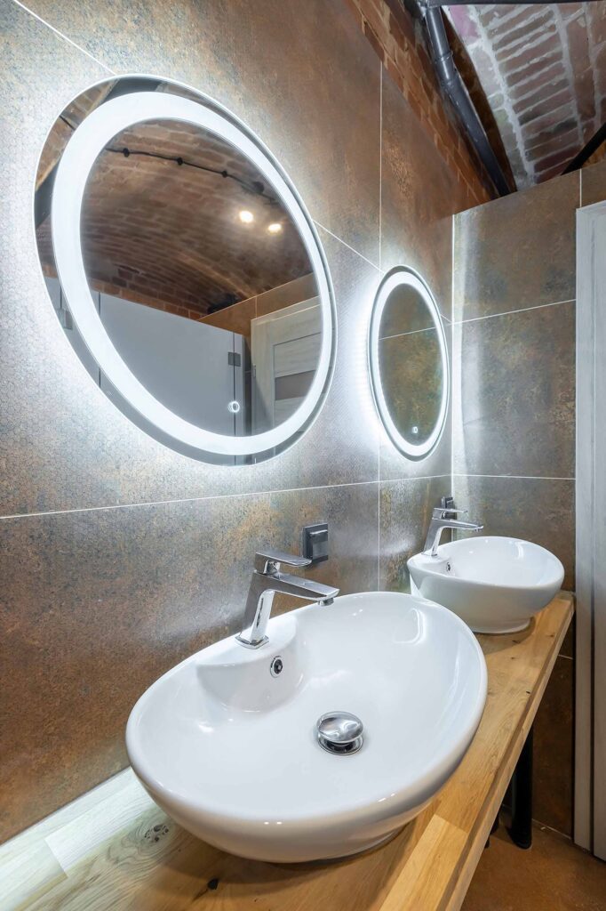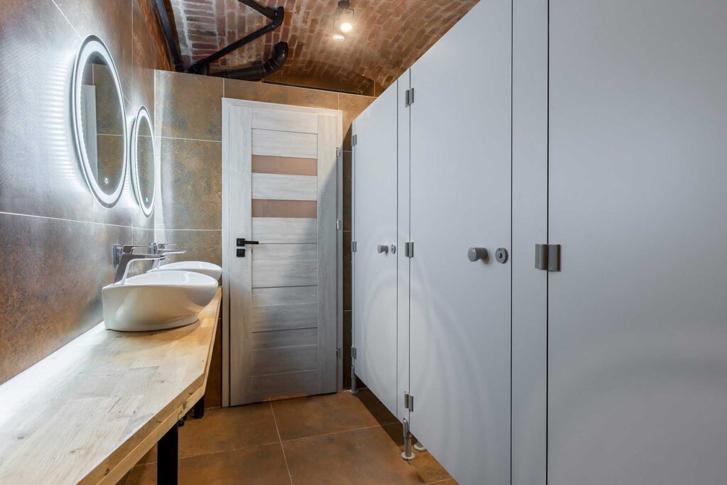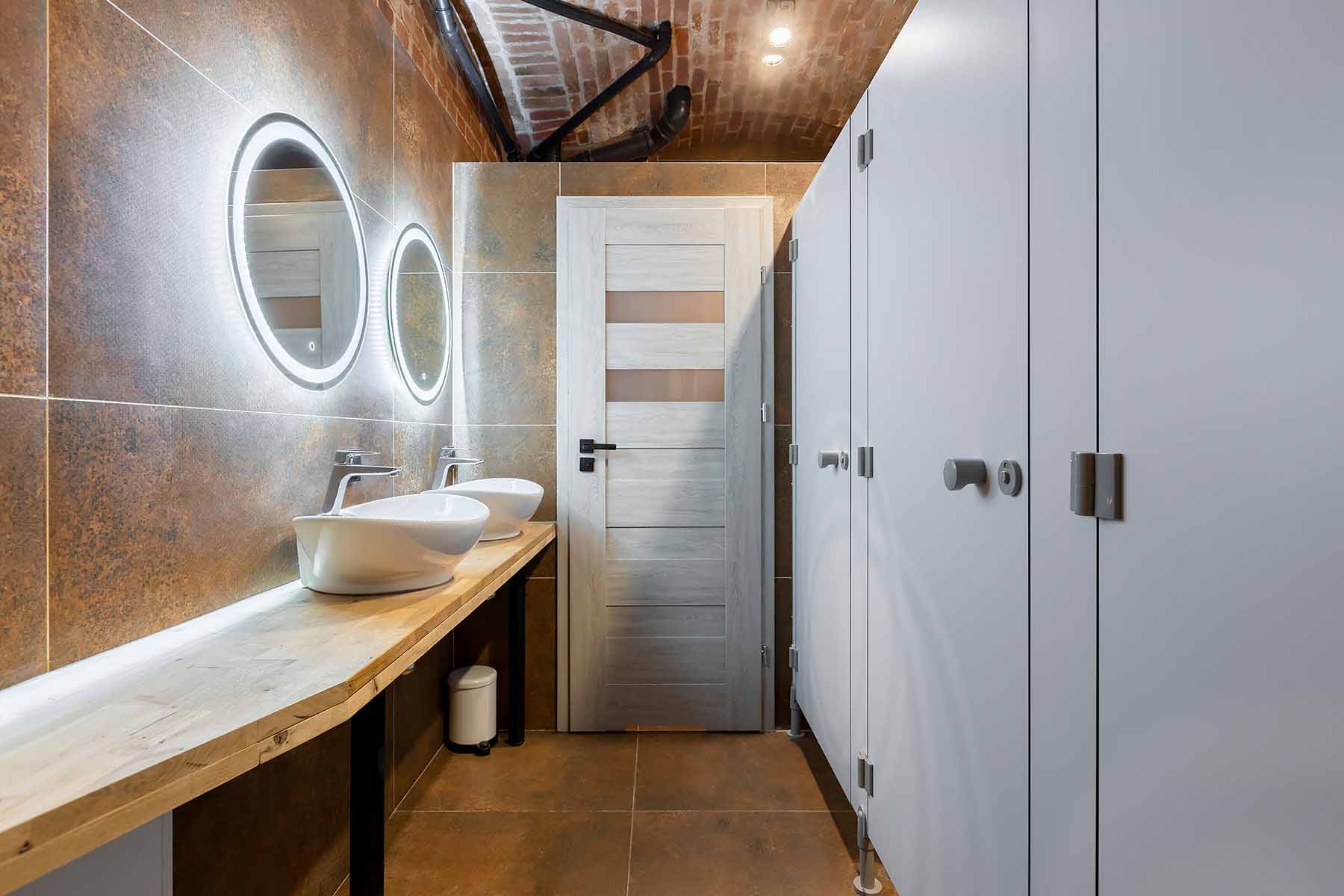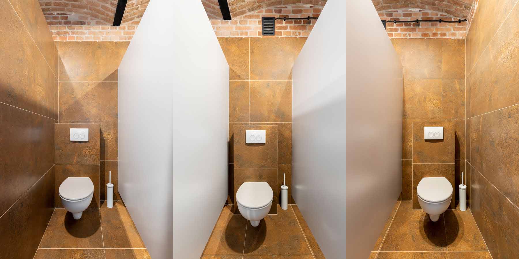 W łazience znajdują się trzy toalety z przegrodami, prysznic oraz 2 umywalki z lustrami.