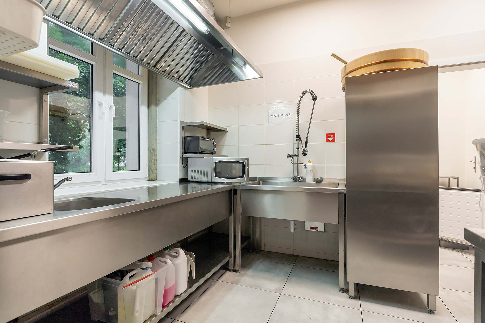 Duża kuchnia, w której sam możesz przygotować przekąski lub dania na imprezę lub udostępnisz to pomieszczenie firmie cateringowej.