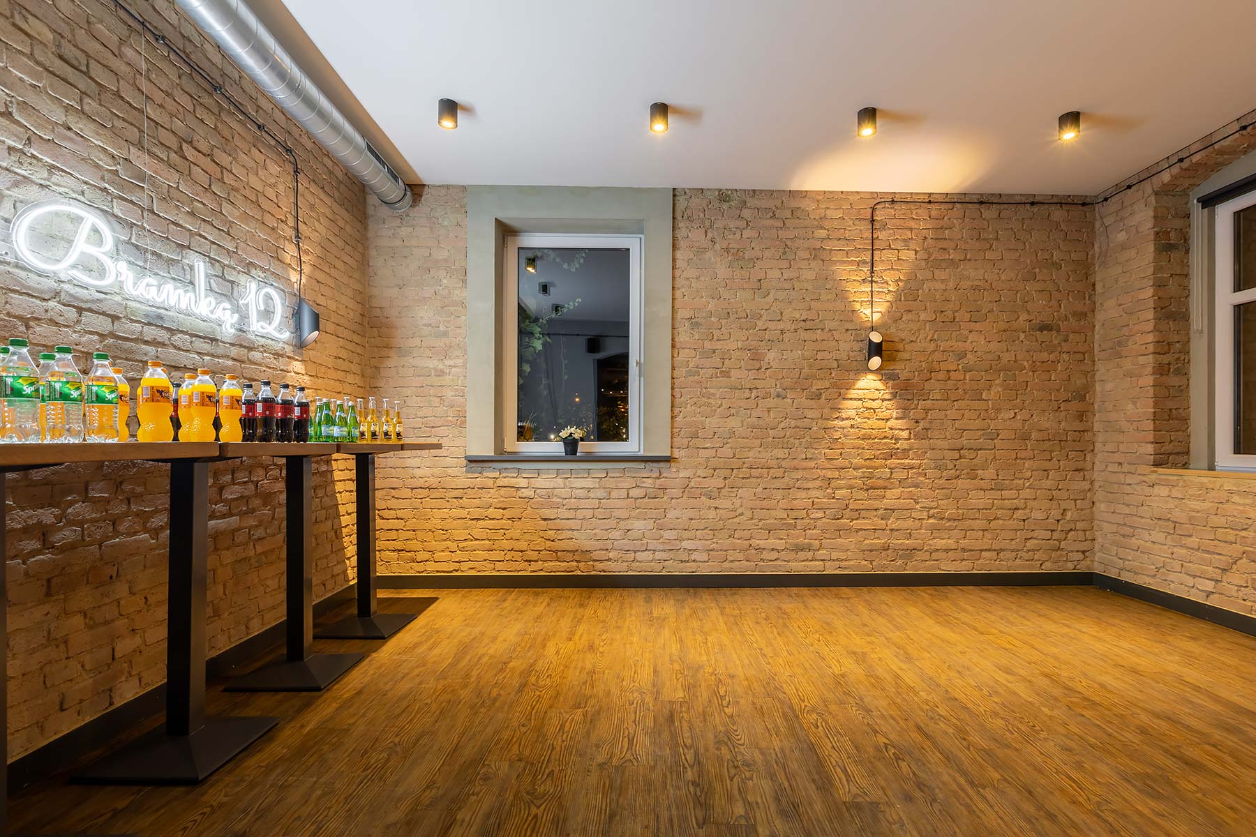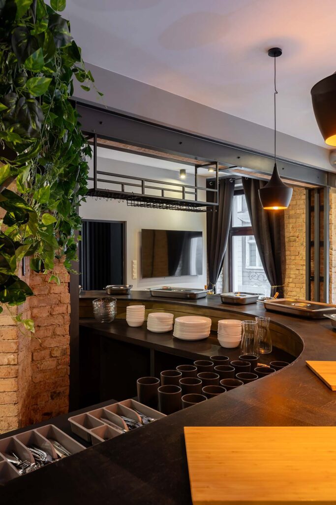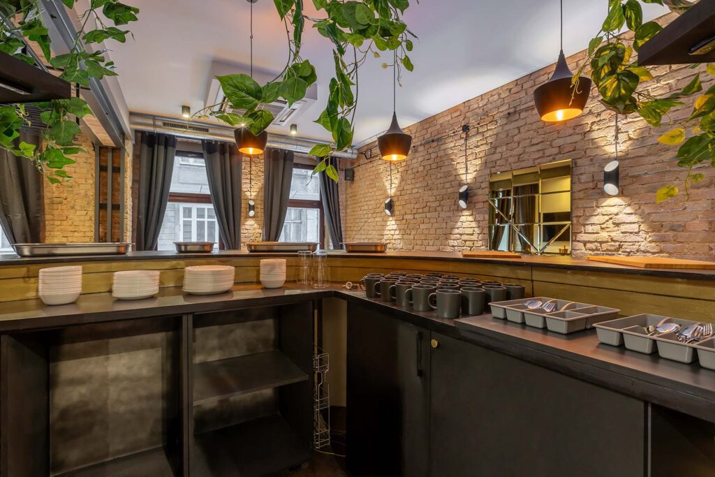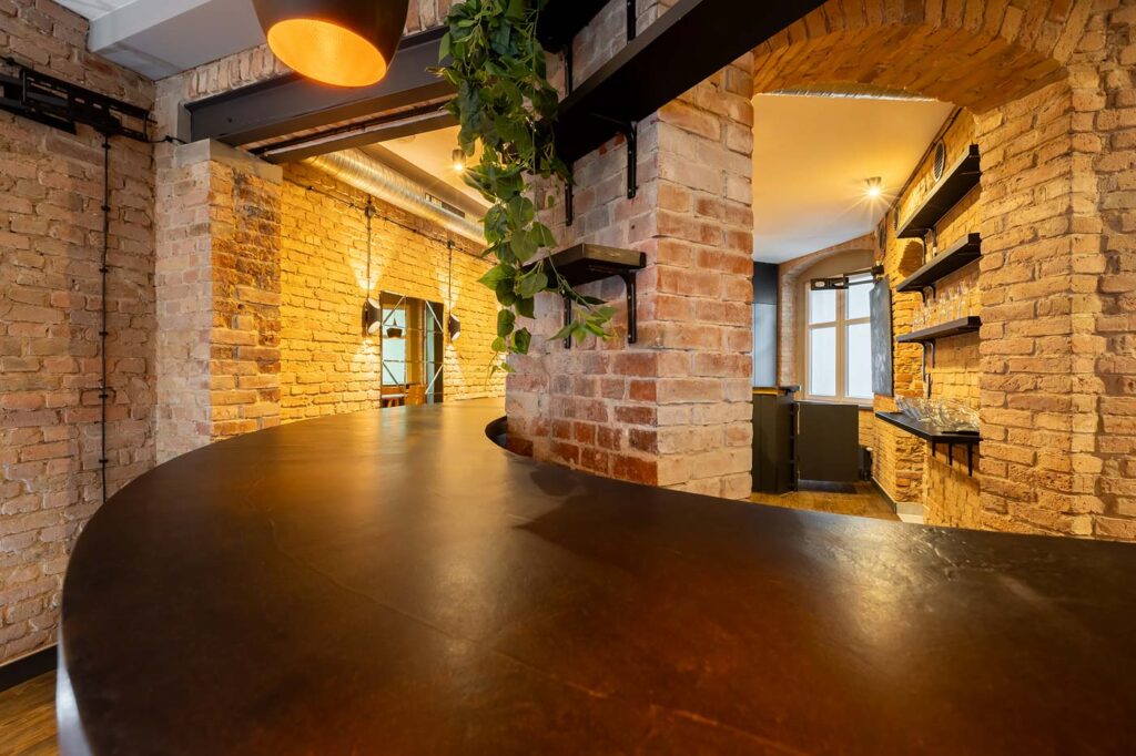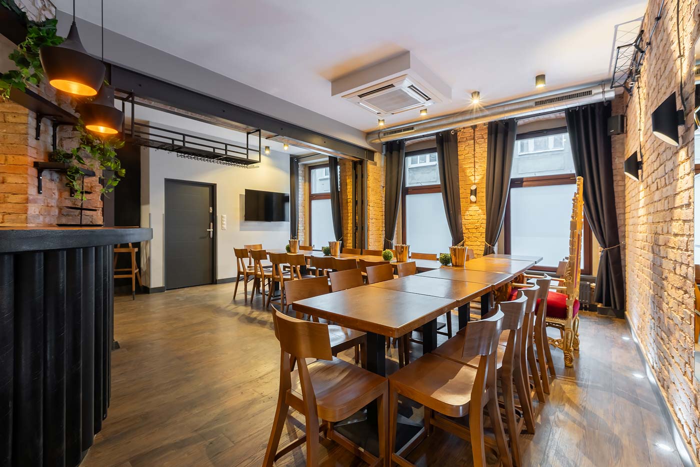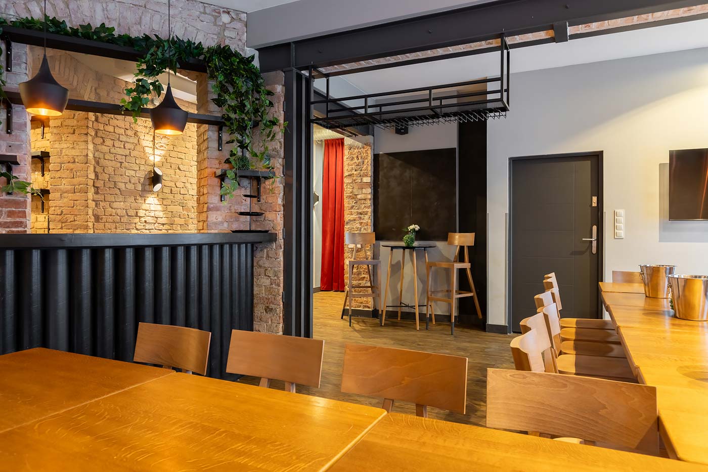 W lokalu znajduje się część jadalna w której można zoorganizować własne lub zamówione jedzenie z cateringu. Na czas wynajmu zostawiamy bemary, w których można umieścić ciepłe posiłki. Duży barowy blat umożliwia też pozostawienie zimnego bufetu, słodkości czy też różnego rodzaju napoi.